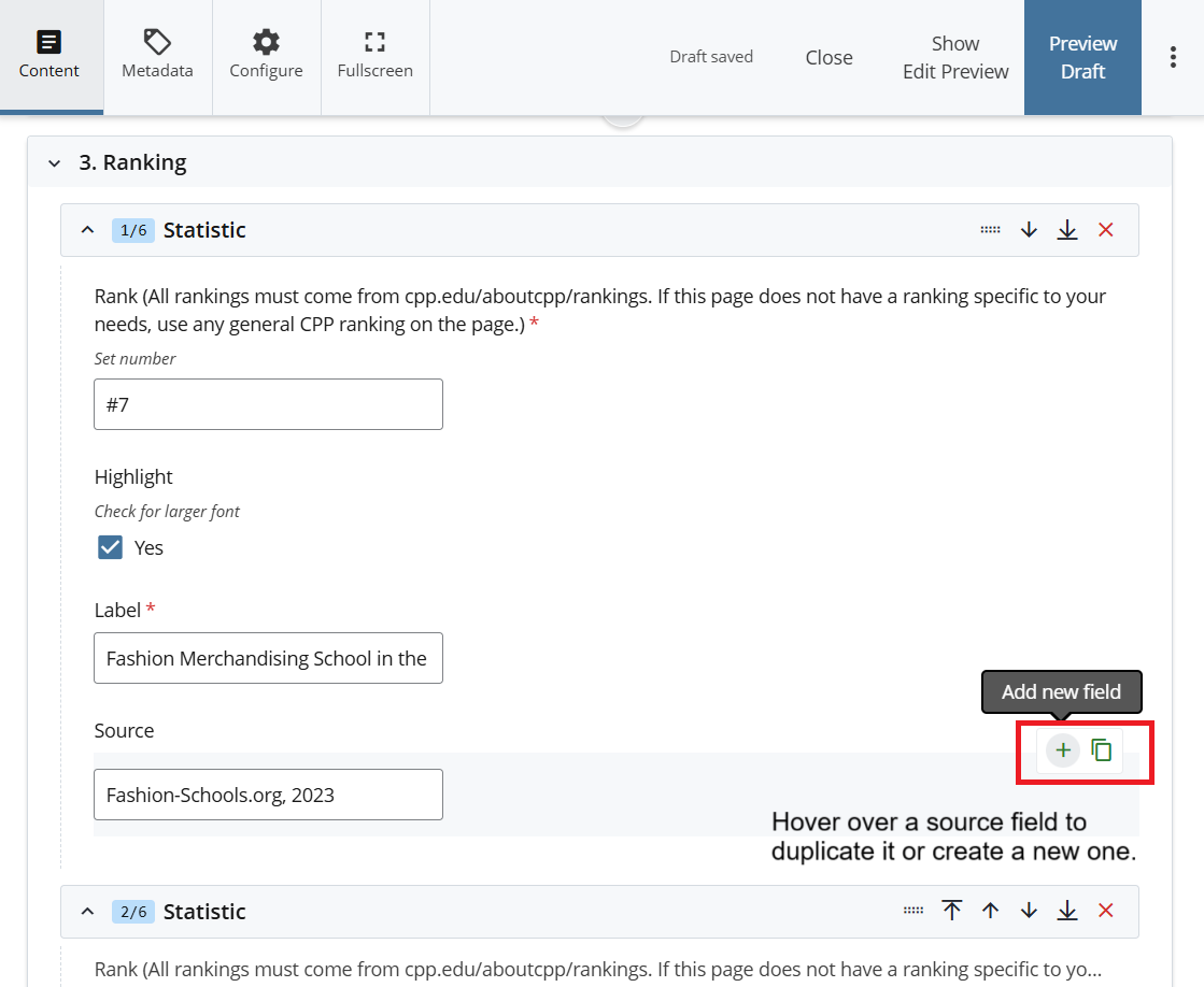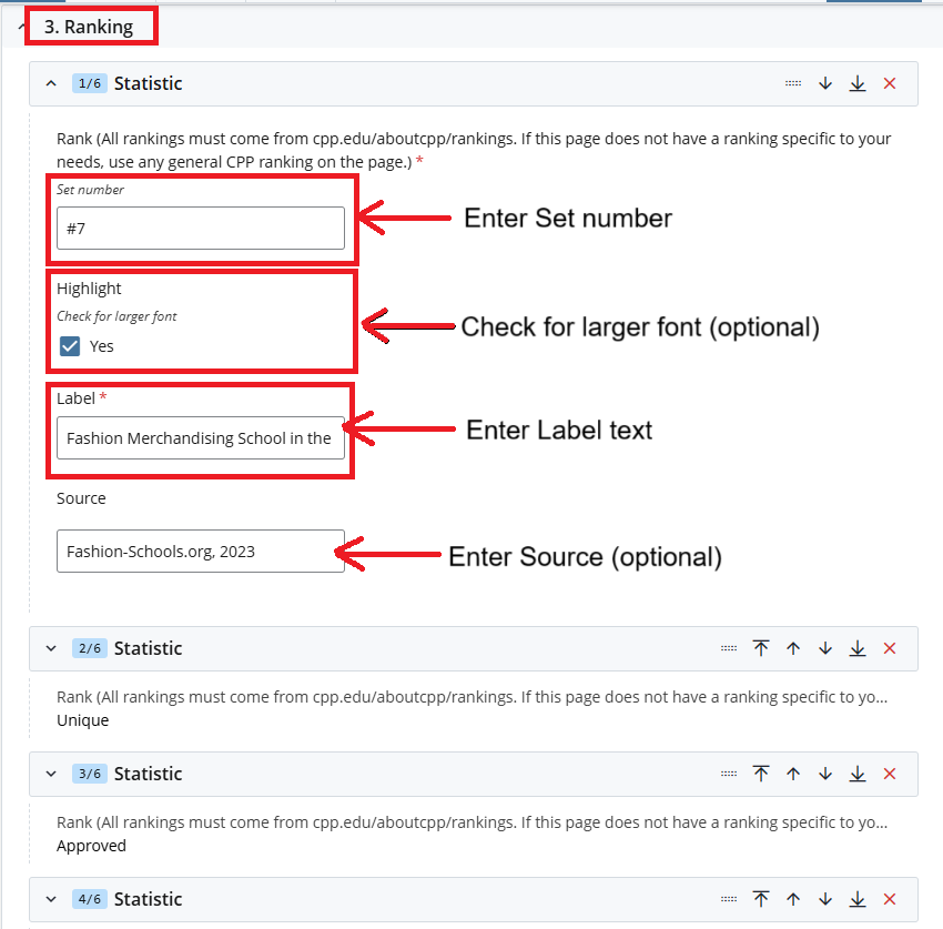 In this Module Rankings for the College of the Department are required, at least one ranking is required for the page and the max number of rankings that can be added are six.