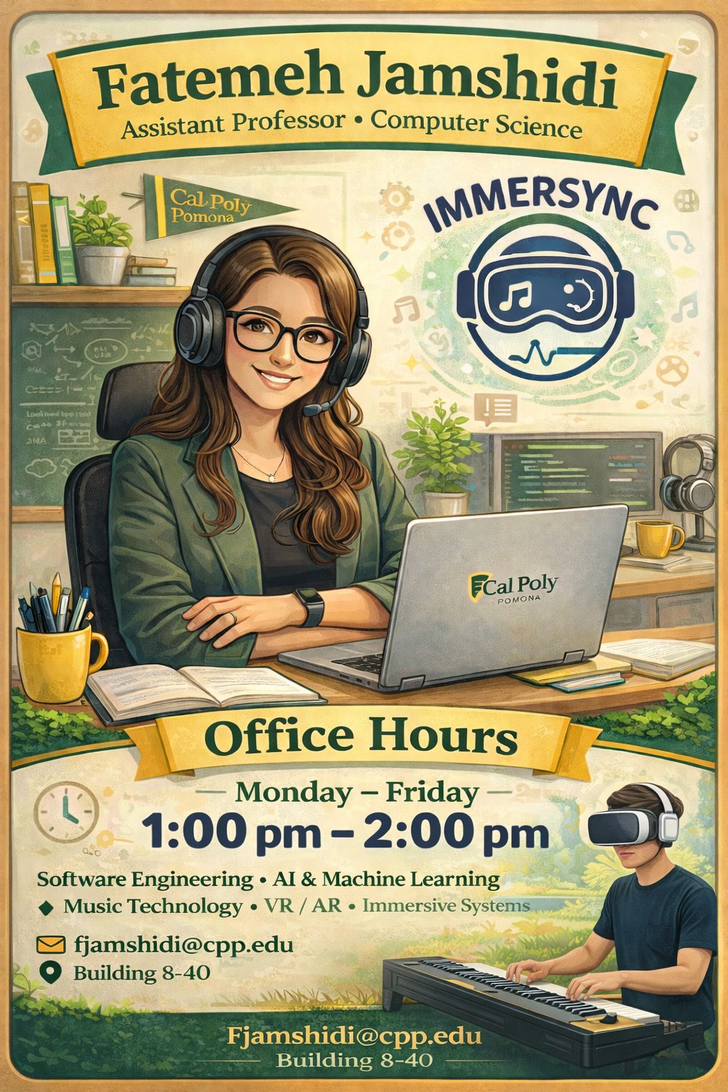 Fatemeh Jamshidi, Ph.D is an Assistant Professor of Computer Science at Cal Poly Pomona, where she proudly joined in August 2024. She brings a dynamic blend of creativity and technical expertise, with research that bridges artificial intelligence, computer science education, computer music, game AI, human-AI collaboration, and augmented and mixed reality. Fatemeh is especially passionate about empowering students, she deeply respects and takes pride in the incredible talent and drive of Cal Poly Pomona’s Computer Science students.