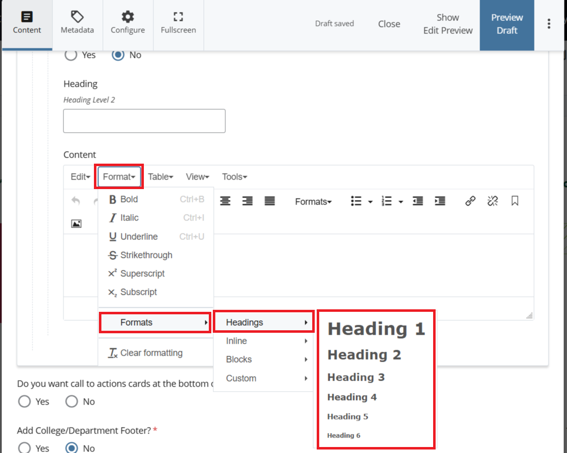 - Reserve Heading 1 and Heading 2 for the page title and section heading fields already provided by the Cascade template.