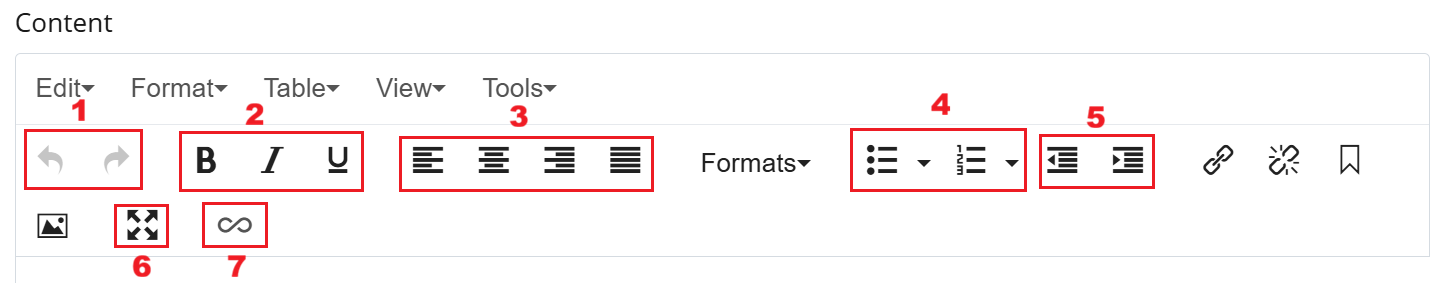 - Undo / Redo - Reverts or restores recent changes made within the editor. This allows users to quickly correct mistakes without manually re-editing content.