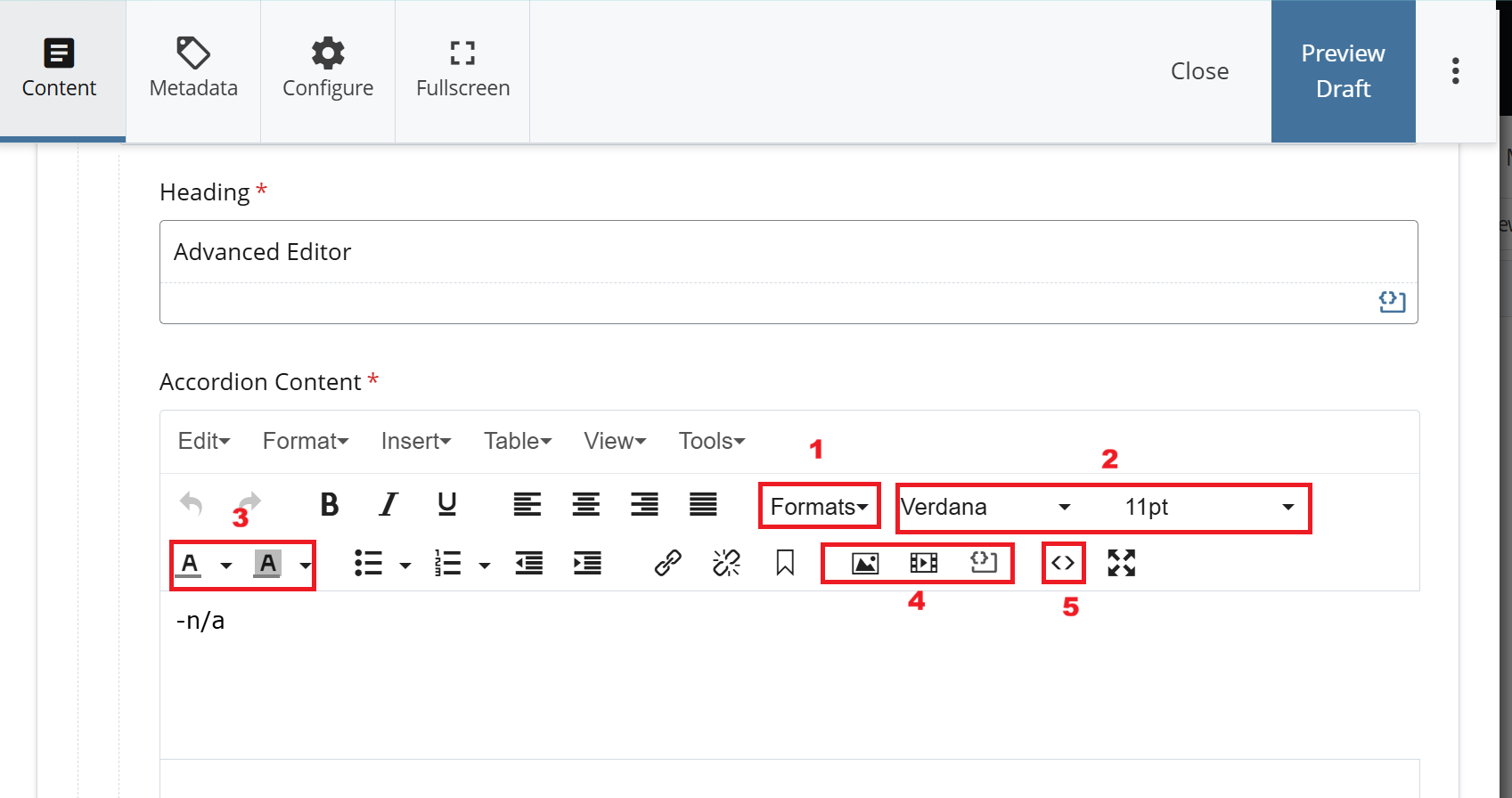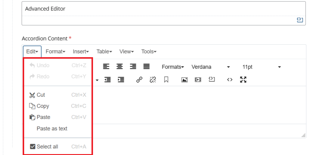 - Advanced Editor (Expanded Toolbar) - Displays additional formatting and editing options not shown in the default view. This mode provides greater control for advanced content formatting needs.