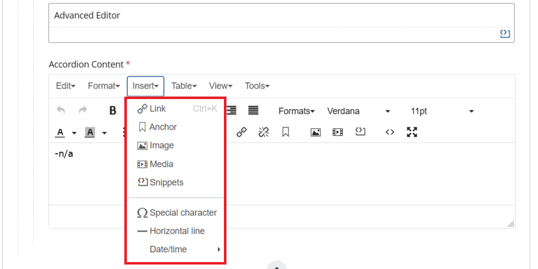 - Media (Images & Video) - Allows insertion and management of images and embedded media within the content. Code Snippet - Inserts preformatted code blocks for displaying technical or programming content.