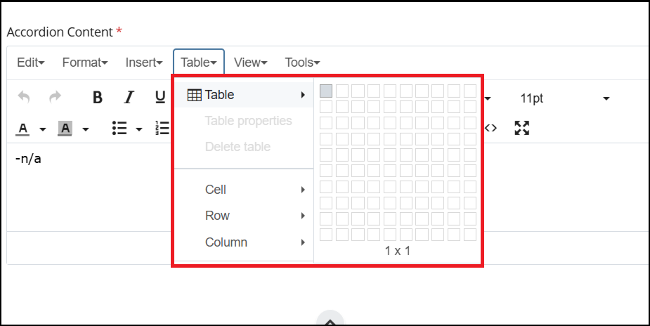 Enables creation and editing of tables, including rows, columns, and cell properties.