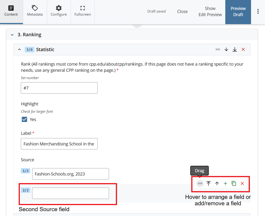 In this Module Rankings for the College of the Department are required, at least one ranking is required for the page and the max number of rankings that can be added are six.