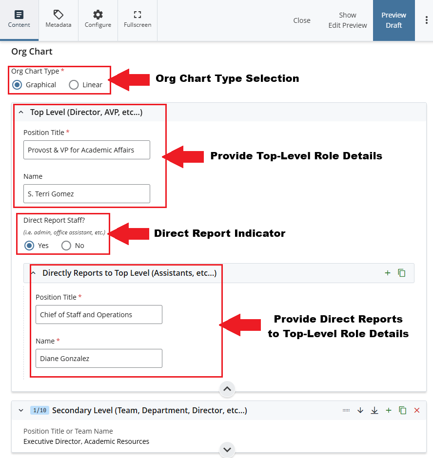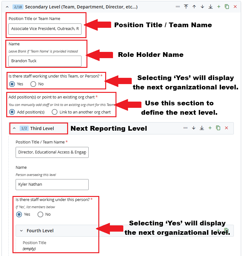 - Role Title and Role Holder Name for Secondary Level, Third Level, Fourth Level, and subsequent sections