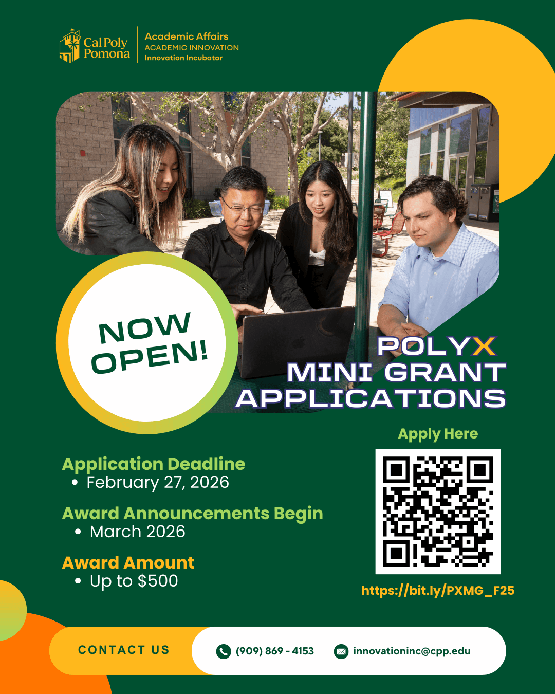 Join the Innovation Incubator Team and colleagues in this virtual workshop to receive guidance, share ideas, and gain clarity as you bring your PolyX ideas to life. More details will be shared soon— please stay tuned!